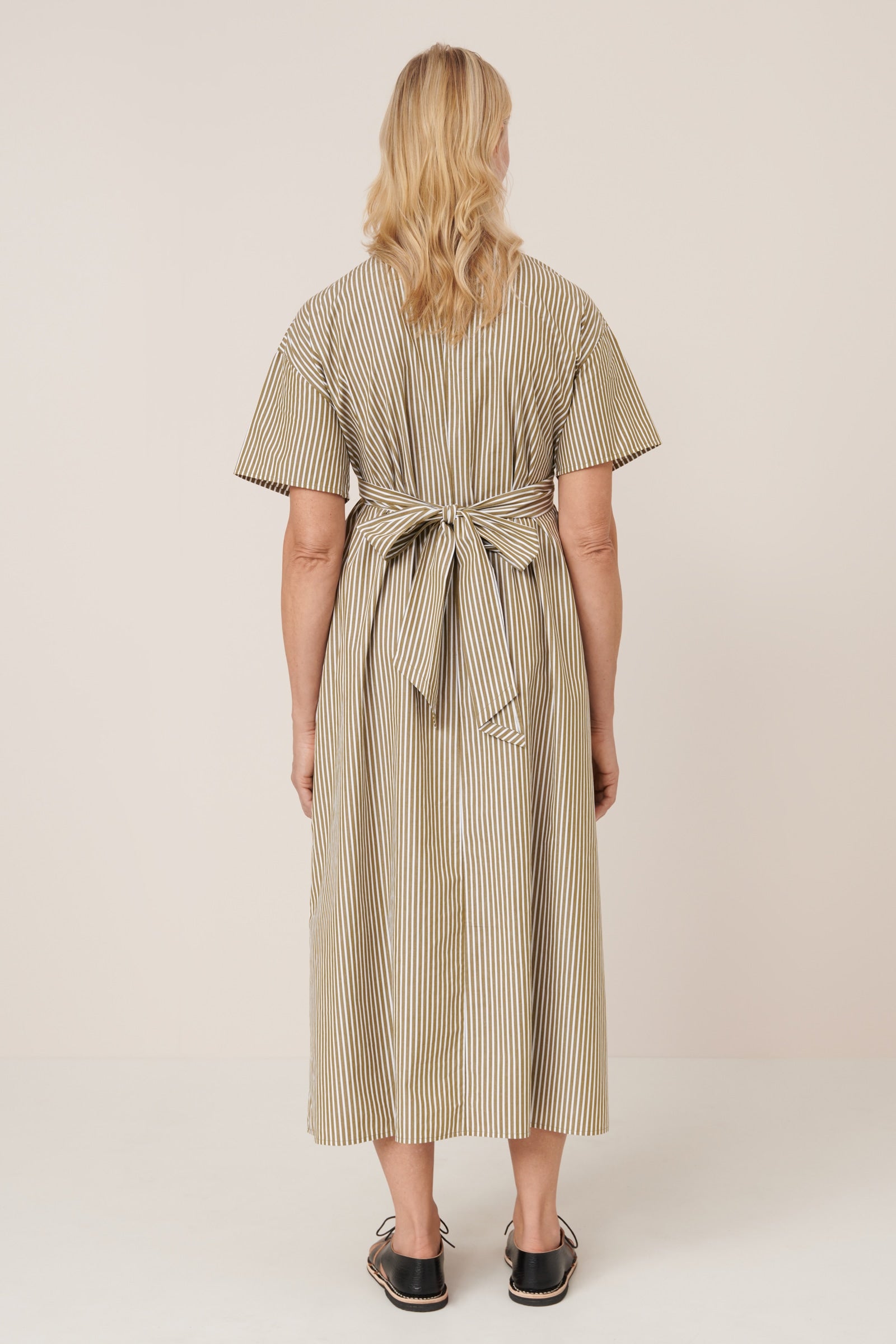 The Composer Dress is defined by its wrap front detail, creating a flattering v-neckline. Crafted from a crisp organic cotton poplin, it features a standard fit with subtle shaping through the back bodice and inseam pockets for effortless functionality.
