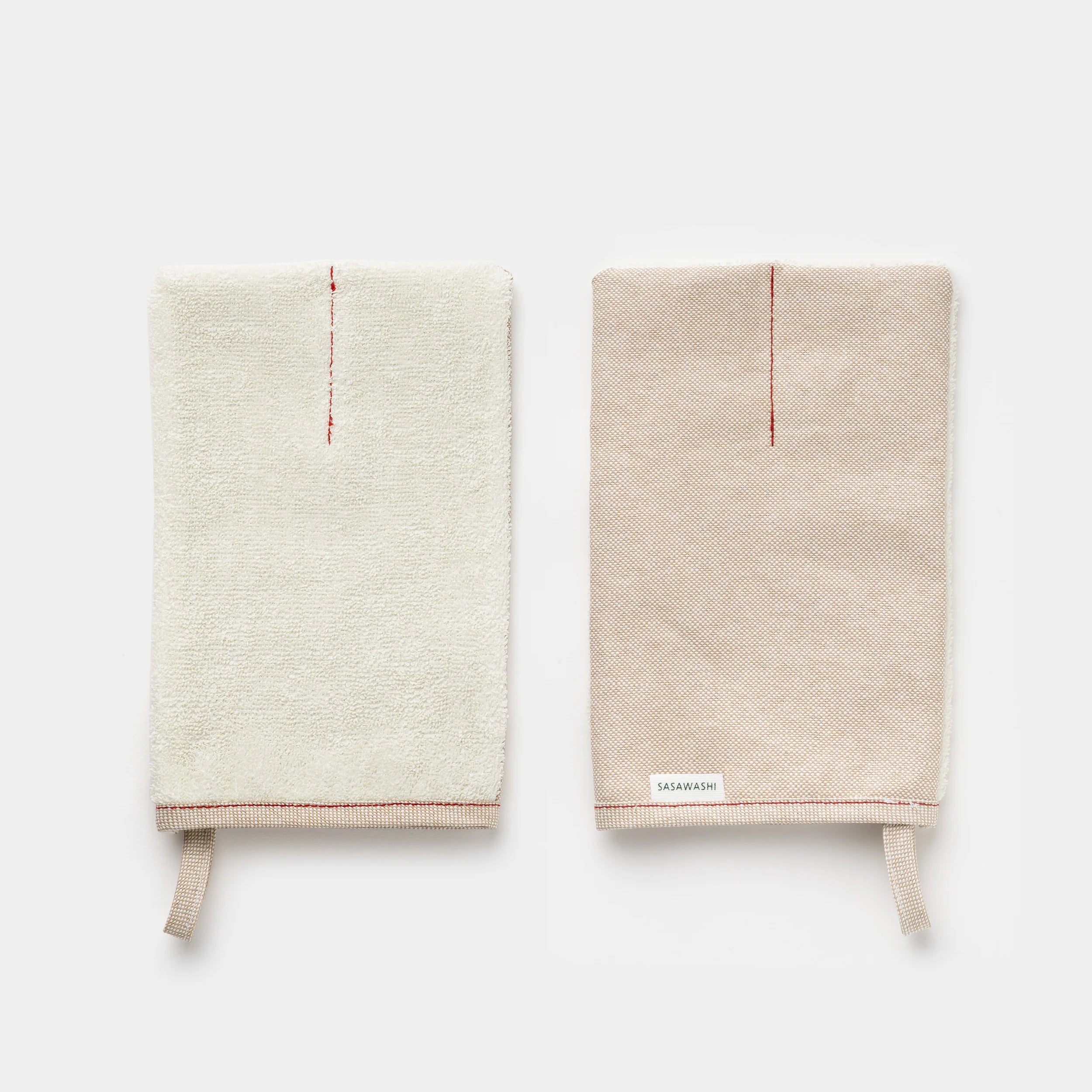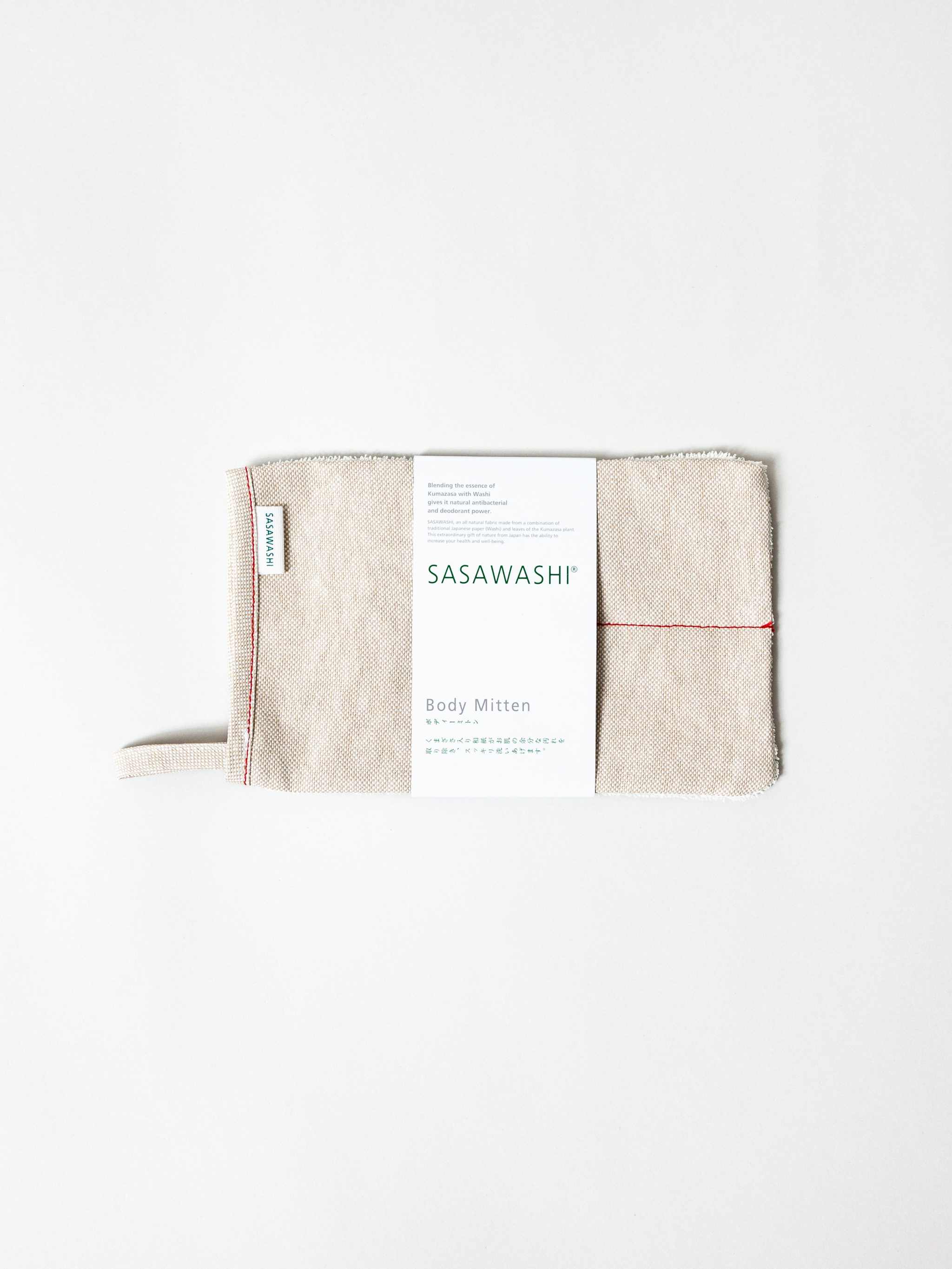 This handy mitten is lightly textured to gently exfoliate and revitalize skin in the shower. The all-natural Sasawashi fabric is made from absorbent washi and deodorizing kumazasa plant fibers that prevent mildew growth and fiber breakage. One side is textured with a terry pile for thorough exfoliation while the backside is made of smooth, woven fibers for quick drying. This cleansing essential is designed for daily use and features a corner accent loop to hang dry after use.