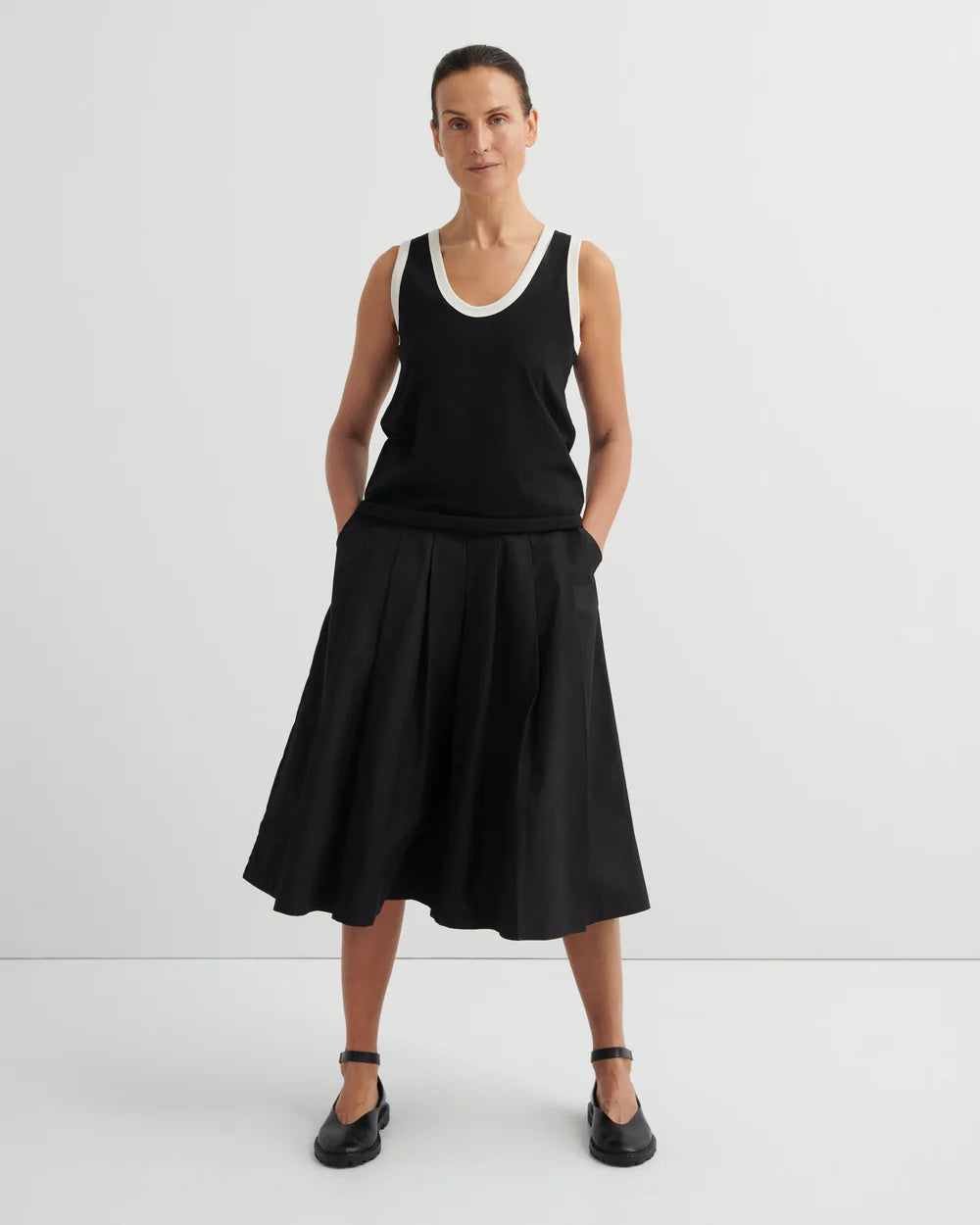 A considered essential, crafted from soft midweight organic cotton jersey and finished with contrast off-white ribbing at the neckline and armholes. Featuring a low scoop neckline and a standard fit through the body, it’s designed for effortless everyday wear.